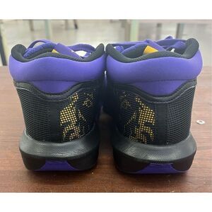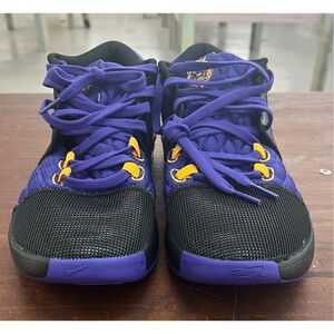 Stylish Nike athletic shoes. Black mesh with purple accents. Gold swoosh detail. Comfortable and durable. No box