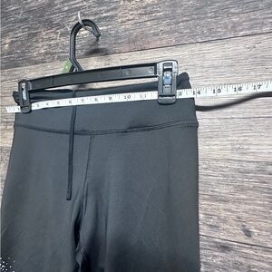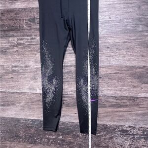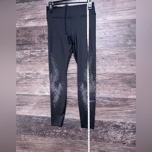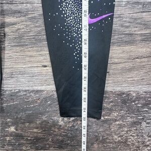 These Nike leggings combine a sleek black design with a striking purple gradient pattern, perfect for adding flair to your athletic wardrobe. Made from a stretchy, moisture-wicking fabric, they offer a comfortable and form-fitting silhouette ideal for workouts. The shimmering specks on the lower legs create a sparkling effect, making them a standout choice for any fitness enthusiast.