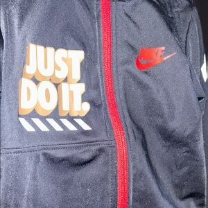 Stylish Nike athletic set in black with bold red trim. Features iconic 'Just Do It' slogan and Nike logo.