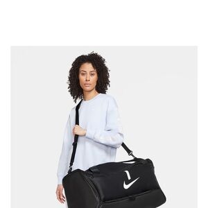 Sleek Nike duffel bag with bold logo. Ideal for gym and travel. Durable and spacious design.