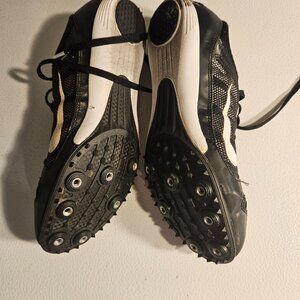 Nike running spikes for Track Season. Sleek black design with white accents. Item is used but still in usable condition for the outdoor season.