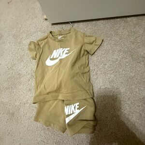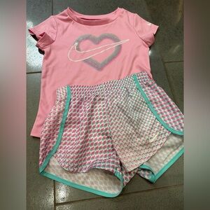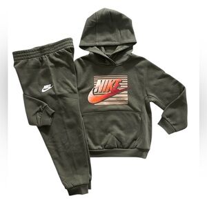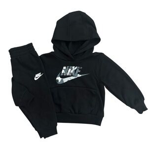 Nike tracksuit in black and white. Features neon pink logo and zipper. Ideal for active kids.