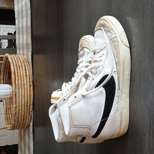 Stylish high-top sneakers with a classic white and black design. Features a prominent black swoosh logo.