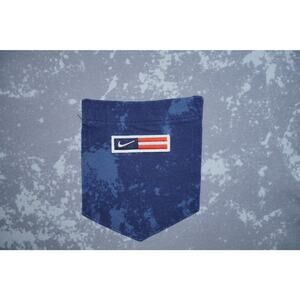 Front: Solid blue chest pocket with Nike Swoosh + striped flag-style detail