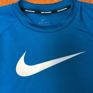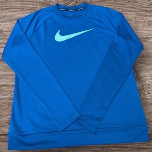 This Nike long-sleeve tee in a striking blue color features the iconic Swoosh logo prominently on the chest. Made from a comfortable cotton blend, it offers a classic crew neckline and a sleek, athletic design perfect for casual wear.