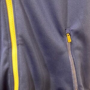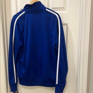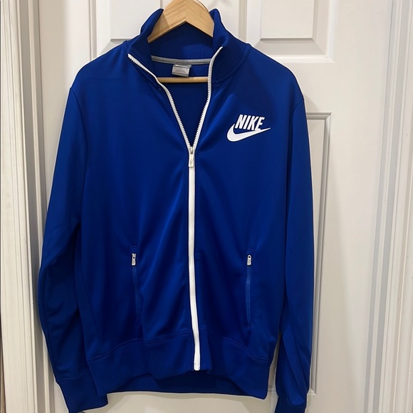 Stylish Nike performance jacket. Vibrant blue color. Full zip with side pockets. Iconic logo on chest.