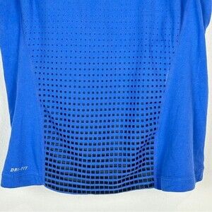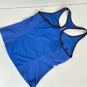 Size L. Built in bra. Blue with black gradient graphic. Gently pre-owned condition.