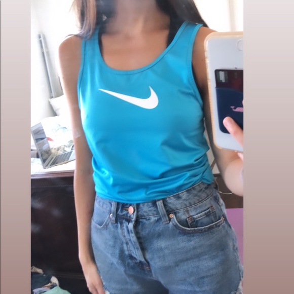 Super light Dry-fit Classic Nike swoosh Razorback tank in an electric sky blue. Can be worn tucked in with Jean shorts, or worn longer and used as a workout top! Really flattering stand-out color. I wear a small and this medium still fits me really well!