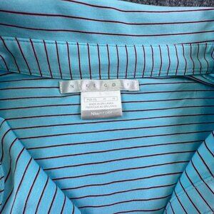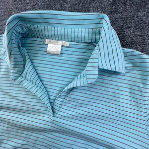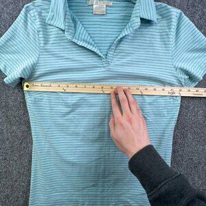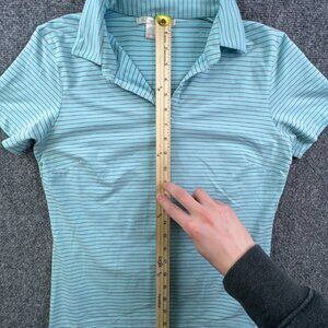Stylish blue striped top. Features a collared design. Short sleeves for comfort.