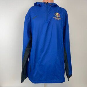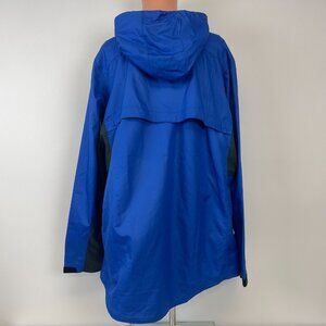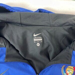 Stylish Nike windbreaker. Features vibrant blue color. Embroidered logo on chest. Perfect for outdoor activities.
