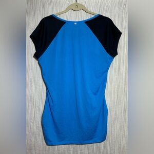 Vibrant blue tee with black sleeves. Perfect for casual wear. Comfortable and stylish.