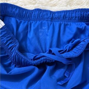 These Nike athletic shorts showcase a striking blue hue complemented by white side panels, perfect for any workout. Crafted from lightweight material, they feature an elastic waistband for a secure fit and a signature curved hem for added style. Ideal for running and training, these shorts embody both comfort and performance.