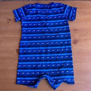 Charming baby romper with blue and white stripes. Features Nike logo. Ideal for everyday comfort.new