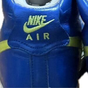 These Nike sneakers showcase a vibrant royal blue upper complemented by a bright neon yellow swoosh logo. The high-top design provides excellent ankle support, making them ideal for athletic activities. Crafted from durable materials, these shoes combine style and functionality.