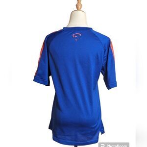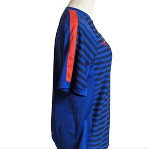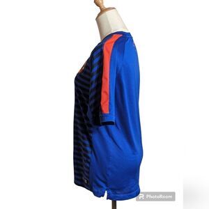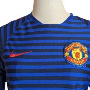 Blue stripe shirt with Manchester United patch. Has stretch. Logo on back of neck may have peeling but not sure if it's supposed to be that way. Good condition.