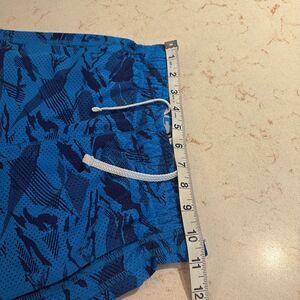 Vibrant blue shorts with dynamic patterns. Comfortable and sporty design. Features drawstring waist.