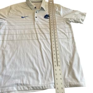 The Nike Boise State Dry Fit Polo in size Large is a stylish and comfortable shirt featuring a solid pattern with a white and blue color scheme. Made from polyester with a light fabric wash, this polo is machine washable for easy care. The embroidered Boise State University logo adds a unique touch to the spread collar and short sleeve design. Perfect for various activities and featuring Nike Dri-FIT technology, this polo is a regular fit and suitable for men.
