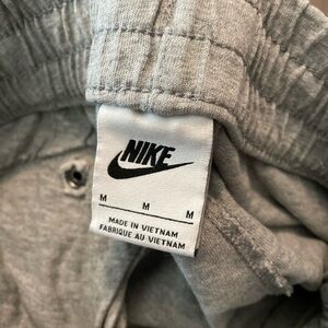 Experience ultimate comfort with these Nike gray athletic shorts, crafted from a soft cotton-blend fabric. The elastic waistband with an adjustable drawstring ensures a perfect fit, while the iconic white Nike swoosh adds a touch of style. Ideal for casual wear, these shorts offer a relaxed fit for everyday activities.