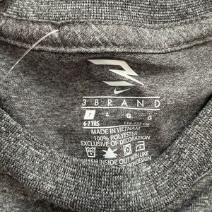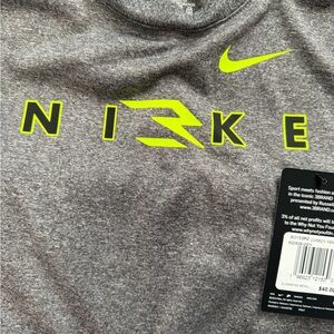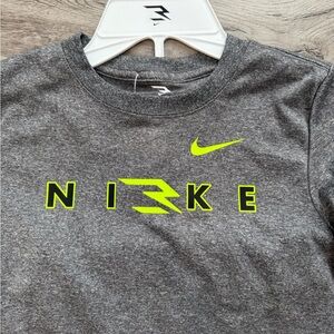 Sporty gray tee with neon yellow Nike logo. Perfect for active play.