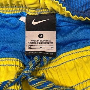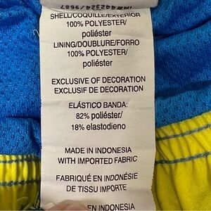 Elastic waistband with drawstring, back pocket with Velcro closure, logo down side of left leg. Blue and navy with yellow accents. 9” inseam.