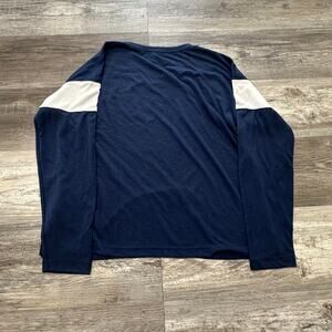 Pre-owned condition, please note that the item has slight pilling present, blue navy and white logo print colorway crew neck long sleeve knit soft graphic logo 100% polyester made in Malaysia US army athletic team workouts casual sporty swoosh lightweight pullover sporty athleisure.