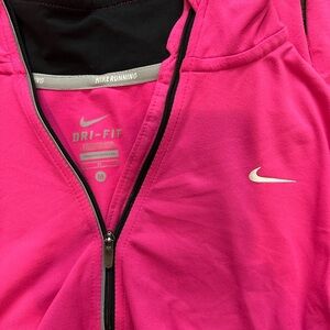 Bold pink Nike jacket with half-zip. Features iconic logo on chest.