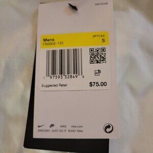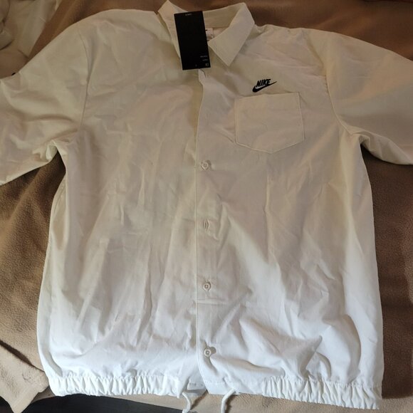 Size small Oxford button up from Nike. Loose/relaxed fit. Comes in a nice bright white. Features pockets and black embroidered Nike logo on the left side of chest. Has drawstings at the bottom to tighten the waist. Very lightweight and trendy and perfect for the summer weather.