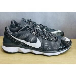The Nike CJ3 Calvin Johnson Trainer is a men's sneaker in size 14 featuring a lace-up closure and low-top design. It showcases a gray and white geometric pattern on Flyweave upper material, providing comfort with foam insoles and a standard shoe width. This 2015 release from Nike's 81 product line is suitable for various activities including gym workouts, casual wear, and training sessions, making it a versatile and stylish athletic shoe for active individuals.