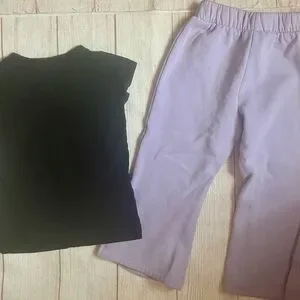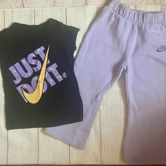 The Nike Casual Pants and Short Sleeve Tee 4T outfit set is perfect for active little ones. Made by trusted brand Nike, this two-piece set includes a lavender and black color scheme with an athleisure theme. The short sleeve tee and elastic waistband pants offer comfort and style, ideal for casual occasions or playtime. Perfect for both baby boys and girls who love to stay active and trendy.