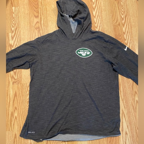 Charcoal Nike hoodie with New York Jets emblem. Dri-FIT technology for comfort.