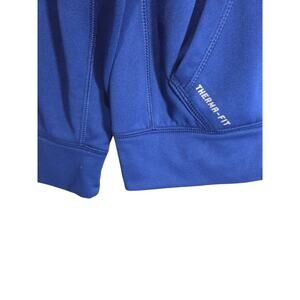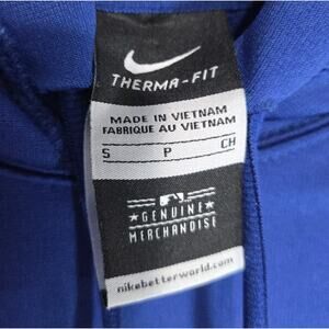 Nike Therma-Fit Chicago Cubs men's hoodie in size Small. Features team spell out logo on the front, kangaroo pockets, and blue/red colorway. High-quality Therma-Fit fabric designed for warmth and comfort.