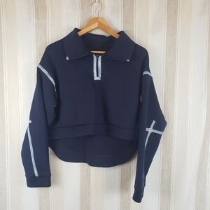 Excellent condition, two small marks on sleeve (see photos), longer length in back, has pockets, quarter zip pullover.