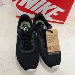 Sleek black running shoes with a bold white Nike swoosh. Ideal for everyday comfort and style.