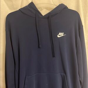 Experience comfort and style with this Nike club fleece navy blue sweatshirt, featuring a relaxed athletic fit and a subtle Nike swoosh logo on the chest. Features a front pocket and drawstring hood.