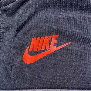 Sporty jacket with bold color blocks. Features Nike logo in red. Perfect for casual wear.