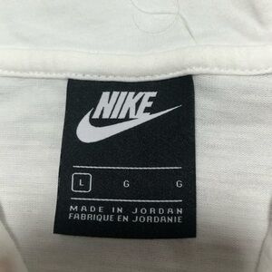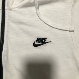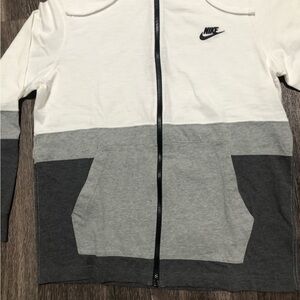 This is a classic and versatile Nike full-zip hoodie, perfect for layering or as a standalone piece. It features a modern colorblock design with three distinct panels: white on top, a lighter gray in the middle, and a darker charcoal gray on the bottom. The arms also follow this colorblock pattern. The hoodie has a full black zipper, an embroidered black Nike swoosh logo on the chest, and a hood with white drawstring ties. The tag indicates it is a size Large. Made from 100% cotton, this hoodie is comfortable and ideal for athletic wear or casual outings.