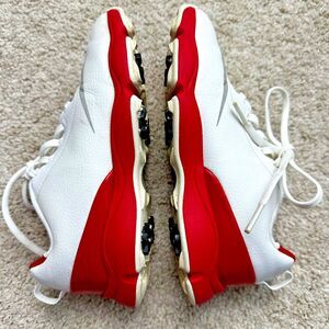 No major flaws. Gently used condition! The Nike Control Jr Golf Shoes in red and white are designed for youth golfers in size 1. These lace-up sneakers feature a low top design with a round toe and a flat heel, making them suitable for activewear during golfing or other athletic activities. The shoes have a plastic cleat type with spikes for added traction, moderate cushioning, and standard shoe width. Perfect for summer and spring seasons, these Nike golf shoes are part of the Nike Golf product line, ensuring both style and performance on the golf course.