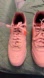 Coral corduroy sneakers featuring a vibrant orange swoosh. Ideal for everyday style.
