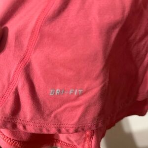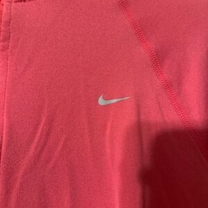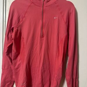 Nike Dri-Fit long sleeve pullover in a striking coral shade. Features a half-zip design.