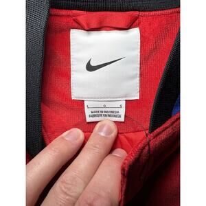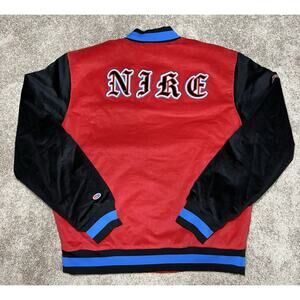 The Nike Corduroy Varsity Jacket 1972 Letterman in red and black, size large, is a stylish and limited edition bomber jacket perfect for casual occasions. Made from cotton corduroy with a nylon lining, this mid-length jacket features embroidered Nike logo accents, a button closure, and a band collar style. Ideal for all seasons, this jacket brings a touch of retro school spirit to any outfit while showcasing the iconic Nike Destroyer product line. Machine washable and featuring a regular fit, this jacket is a must-have for men looking to make a statement with their outerwear.