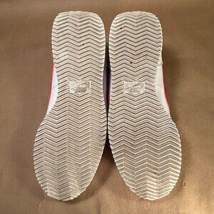 Super clean with minimal tread wear. No scuffs or cuts. Light pilling on ankle liner. Insoles in excellent, unstained condition. Forrest Gump edition Nike Cortez is a faithful reproduction of the shoe that debuted in 1972. All-leather upper with foam midsole and rubber zig zag tread. Metal lace charms and retro tongue tabs complete the look. 819719-103. White with Varsity Red and Blue trim.