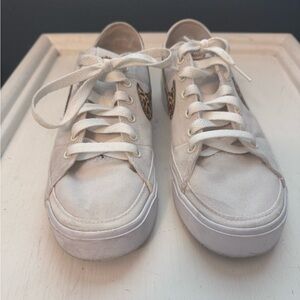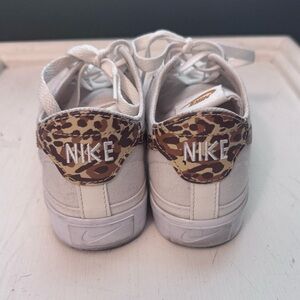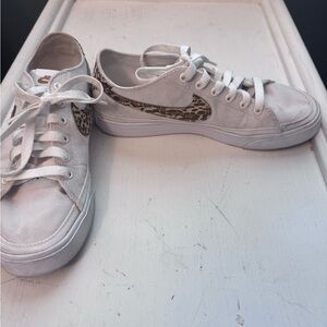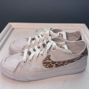 Chic Nike sneakers with leopard print swoosh. Cream canvas for a stylish look. Perfect for casual wear.