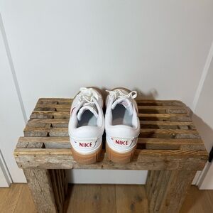 Stylish Nike sneakers in white with red accents and a gum sole. Perfect for casual wear. Excellent condition 7.5