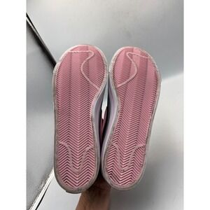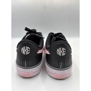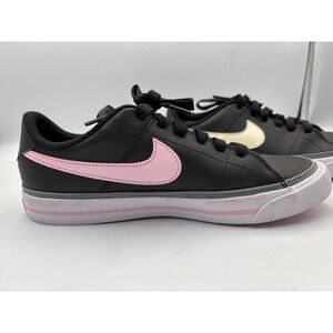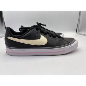 Nike Court Legacy SE (GS) Black/Cashmere/Pink Girl's Sneakers in size 6Y. These low top sneakers feature a lace-up closure and are designed for activewear. The color is Black/Cashmere/Pink, made with Leather/Manmade upper material. They are suitable for various activities like school, running & jogging, and the beach. The brand is Nike, and they are a part of the Nike Court Legacy product line. These issues have been tried on and have a couple scuffs on them, but they have never been worn outside.