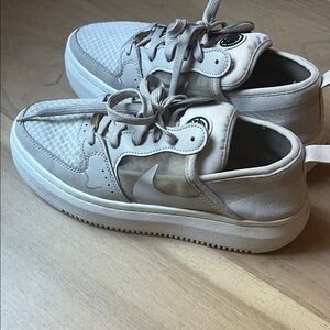 Chunky platform, nude color scheme. Size 9. I am normally a size 8.5, so these run a tad bit small!