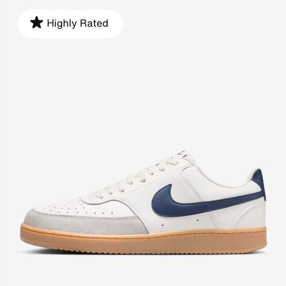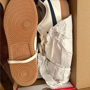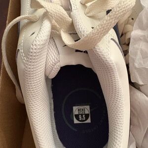 Stylish Nike sneakers with a white upper and blue swoosh. Perfect for casual wear. Men size 9.5 Women size 11.