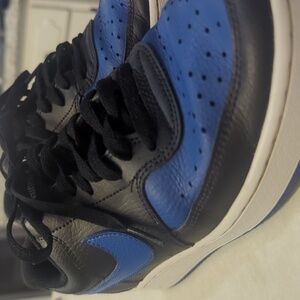 elevate your sneaker game with these Nike Court Vision low sneakers, featuring A sleek black and blue colorway. inspired by classic basketball shoes from the '80s, these kicks blend retro style with modern comfort. they feature perforated toe and sides for breathability, low-cut collar for a natural comfortable fit around the ankle, rubber outsole for traction and durability. . these sneakers offer a timeless design that pairs well with various outfits, making them a versatile addition to your wardrobe. whether you're hitting the court or the streets, they'll keep you looking fresh.