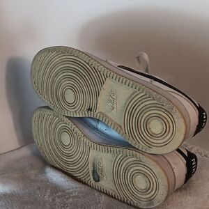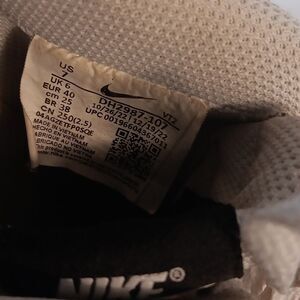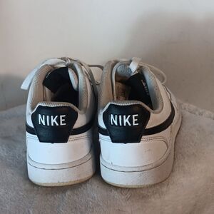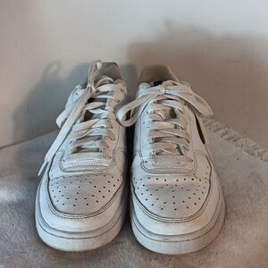 Experience the timeless appeal of Nike sneakers with a sleek white leather upper and bold black swoosh. Men's size 7. These low-top sneakers feature a perforated toe box and a chunky profile, offering both style and comfort for everyday wear.