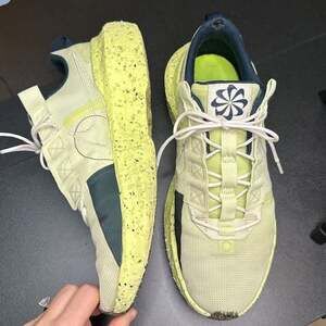 Nike Crater Impact Lime Ice Athletic Running Shoes, US Men's Size 11.5. These sneakers feature a unique speckled lime green sole made from recycled Crater foam, a nod to sustainable design. The upper is a blend of light green and navy accents, with a distinctive pinwheel logo on the tongue. Ideal for athletic activities or casual wear, offering both style and comfort. Excellent pre-owned condition with minimal signs of wear.