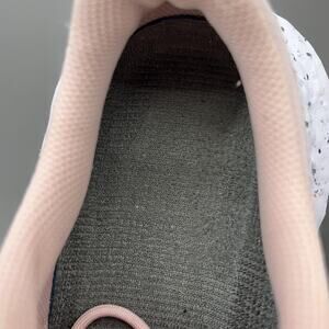 Color: Light pink and peach upper with white speckled midsole and black outsole accents.